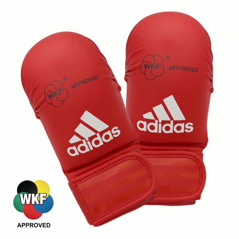 Coppia di guantini Karate Kumite Adidas WKF, guanti ADIDAS per Kumite indossati degli atleti delle Nazionale di diversi paesi, dispongono di due passanti per le dita, la protezione per il pollice e una comoda chiusura con velcro per un'ottima presa. Realizzato in vinile con imbottitura, disponibile nei colori rosso o blu, omologato WKF (World Karate Federation) questo garantisce la partecipazione ad ogni gara.