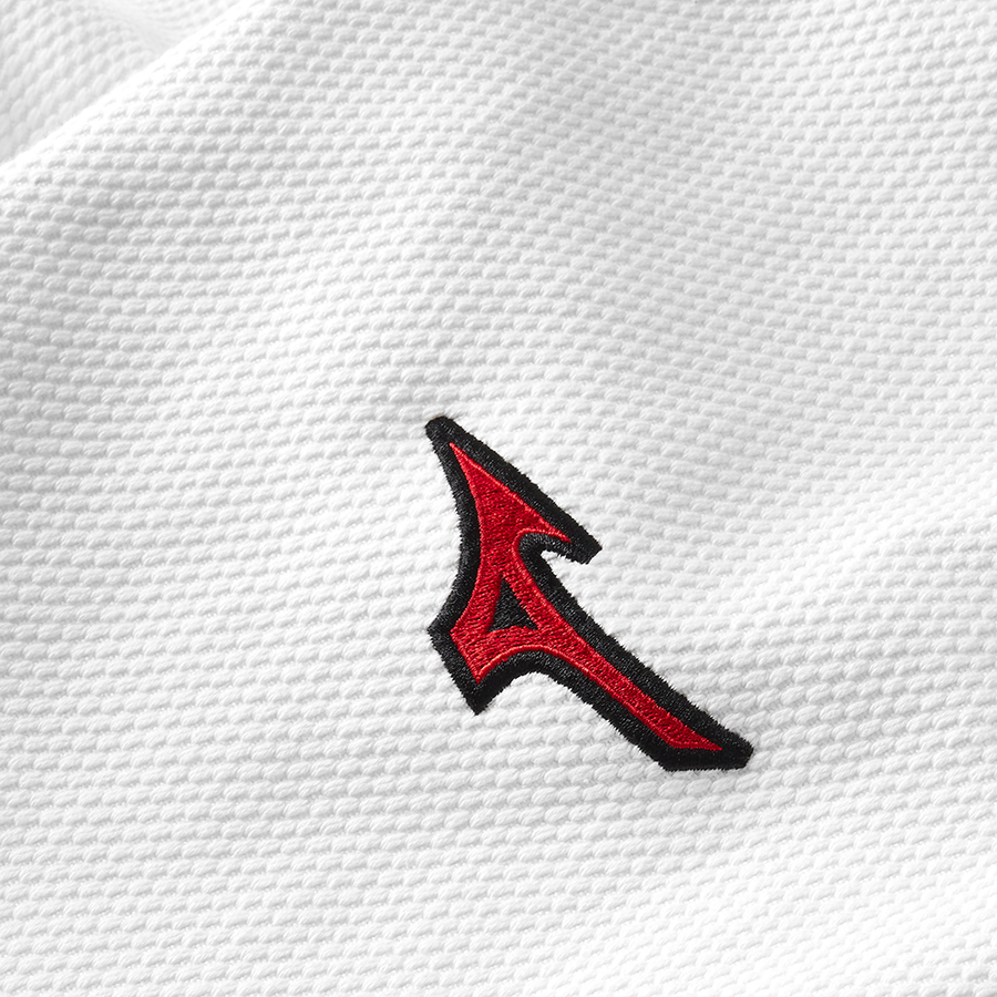 Realizzata in tessuto pesante cotone 100% grana di riso ha un'etichetta nera all'interno del collo con logo Mizuno Bianco, logo Mizuno rosso ricamato sulla manica sinistra, etichetta nera con logo Mizuno bianco sul fondo della giacca.